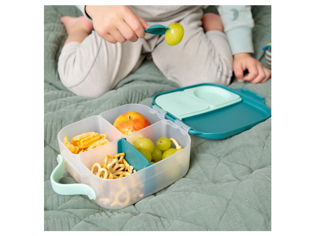 Silikónové tesnenie potom dovolí skladovať v menších oddeleniach jogurt alebo dip (nie tekutiny). Jedna z vnútorných "prepážok" je vyberateľná a nastaviteľná, takže si tento desiatový box prestavíte podľa svojich chutí a potrieb. Do krabičky sa zmestí napríklad aj wrap alebo banán. Je len na vás, čo dieťaťu alebo sebe do tohto desiatového boxu zabalíte. Jednoduché otváranie umožní deťom samostatne sa obslúžiť.