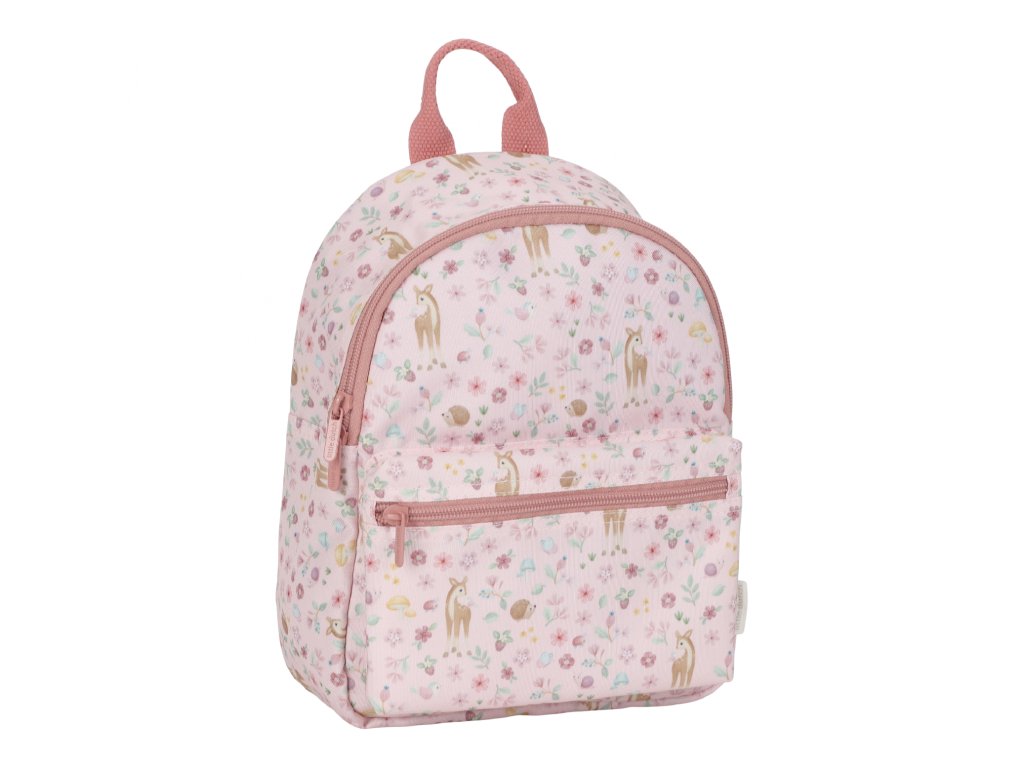 Rozkošný detský batoh potlačený obrázkami zvieratiek a motívmi zo života je ideálnym doplnkom na výlety do prírody aj prechádzky mestom. Batoh má nastaviteľné ramenné popruhy a hrudný pás na príjemné nosenie. Držadlo umožňuje prenášanie v ruke. Batoh je vybavený vonkajším vreckom na zips na uloženie drobností a vnútorný priestor s vreckom, elastickým držiakom na pitie a menovkou.
