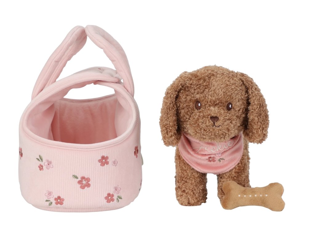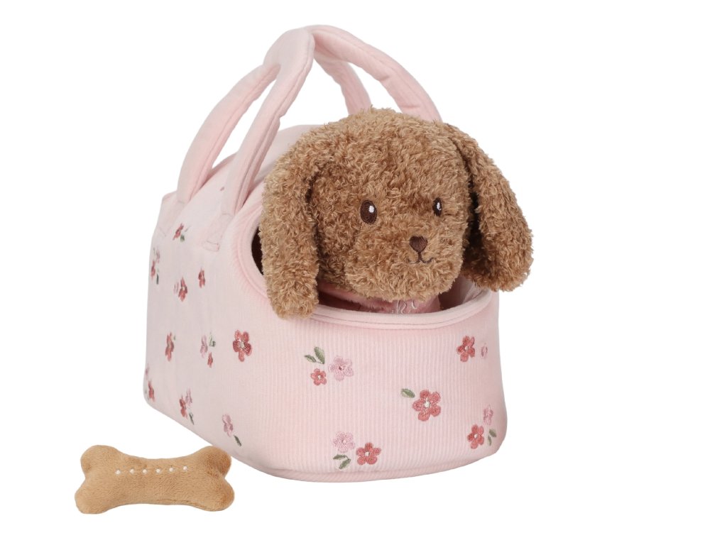 Psík prichádza v elegantnej kvetovanej taške s predným otvorom, aby mohol zvedavo vykukovať von. Vďaka tomu si ho deti môžu vziať kamkoľvek – na prechádzku, na výlet, do škôlky alebo napríklad k starým rodičom. Okolo krku má uviazanú šatku so svojim menom. Plyšová kosť na hranie má vo vnútri magnet, takže drží psíkovi pri papuľke