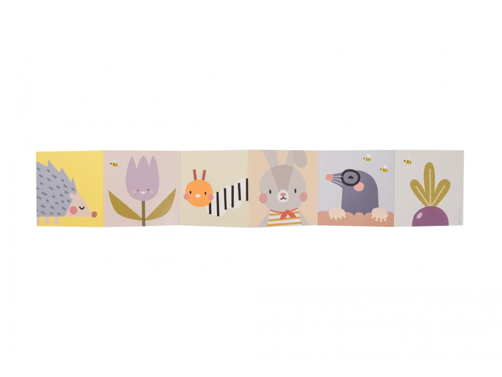 súčasťou balenia je aj krásne obojstranné leporelo s ilustráciami pre dve vývojové štádiá dieťaťa (vysoko kontrastné jednoduché obrázky pre deti od narodenia, farebné výrazné obrázky pre deti od cca 3 mesiacov)